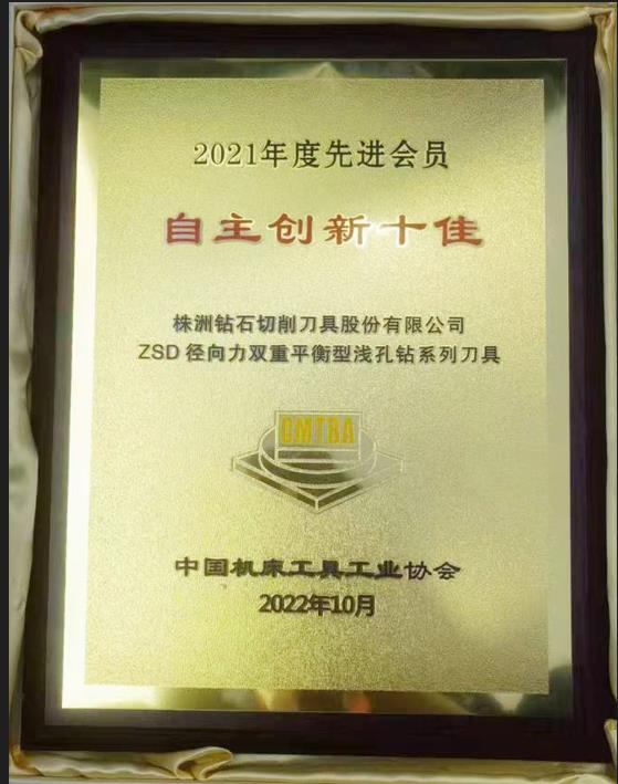 2023年4月10日,公司憑借“ZSD徑向力雙重平衡型淺孔鉆”系列刀具,榮獲機(jī)床工具行業(yè)2021年度自主創(chuàng)新十佳獎(jiǎng)。