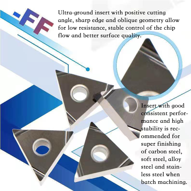 Insert adopts positive cutting angle with sharp edge structure, the mirror effect of the rake side of the insert, and the curved cutting edge for finely control of the chip flow.