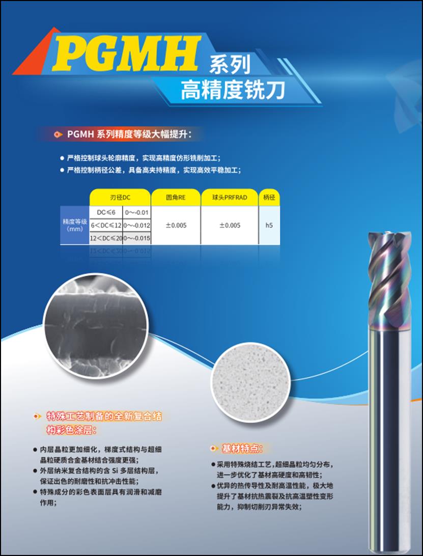 適合高硬度高精度加工的PGMH整體硬質(zhì)合金銑刀:PGMH系列采用特殊燒結(jié)工藝,超細(xì)晶?;模哂懈玫臒醾鲗?dǎo)性和耐高溫性能,在高速高效加工過程中具備更好的抗熱震裂及抗高溫塑性變形性能;采用全新復(fù)合結(jié)構(gòu)彩色涂層,內(nèi)層的晶粒更細(xì),梯度式結(jié)構(gòu)與超細(xì)晶粒硬質(zhì)合金基體的結(jié)合強(qiáng)度高;外層采用納米復(fù)合結(jié)構(gòu)多層結(jié)構(gòu),保證了出色的耐磨性和抗沖擊性能;特殊彩色表面層,具有更好的潤滑和減磨作用,辨識度高;在結(jié)構(gòu)方面采用大芯厚高剛性設(shè)計(jì),保證在大參數(shù)切削環(huán)境下加工過程的平穩(wěn)。
